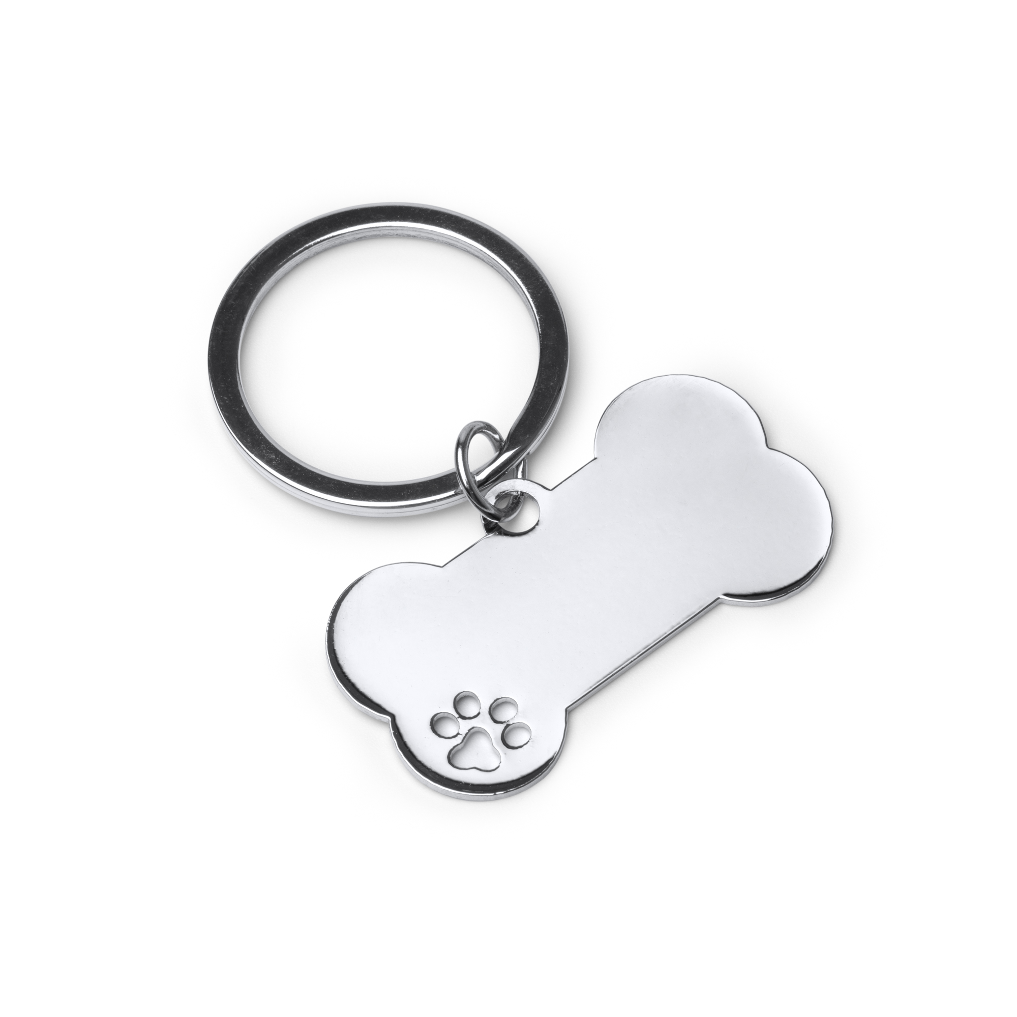 201 metallnøkkelring med benformet design. Med fingeravtrykksdetalj på siden.