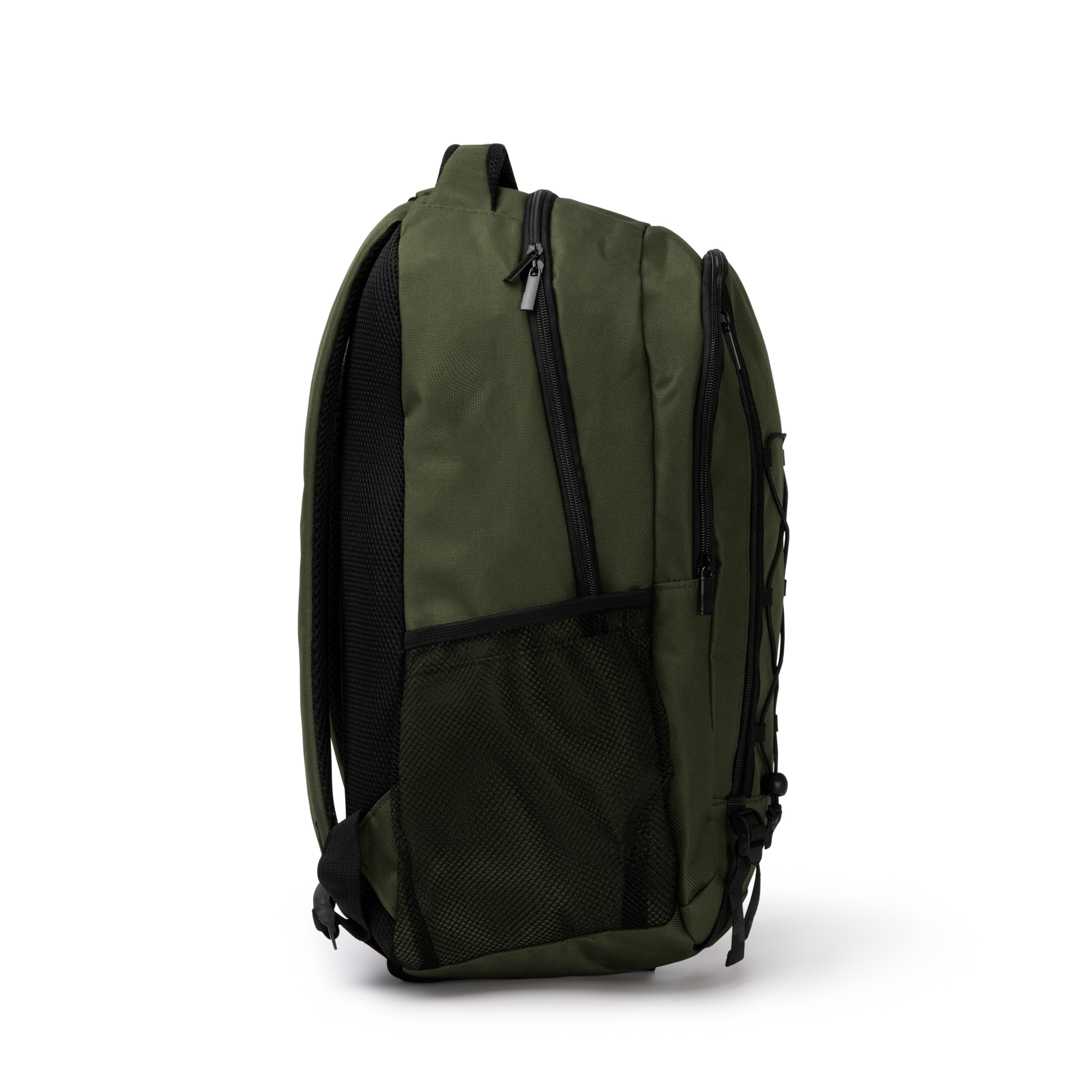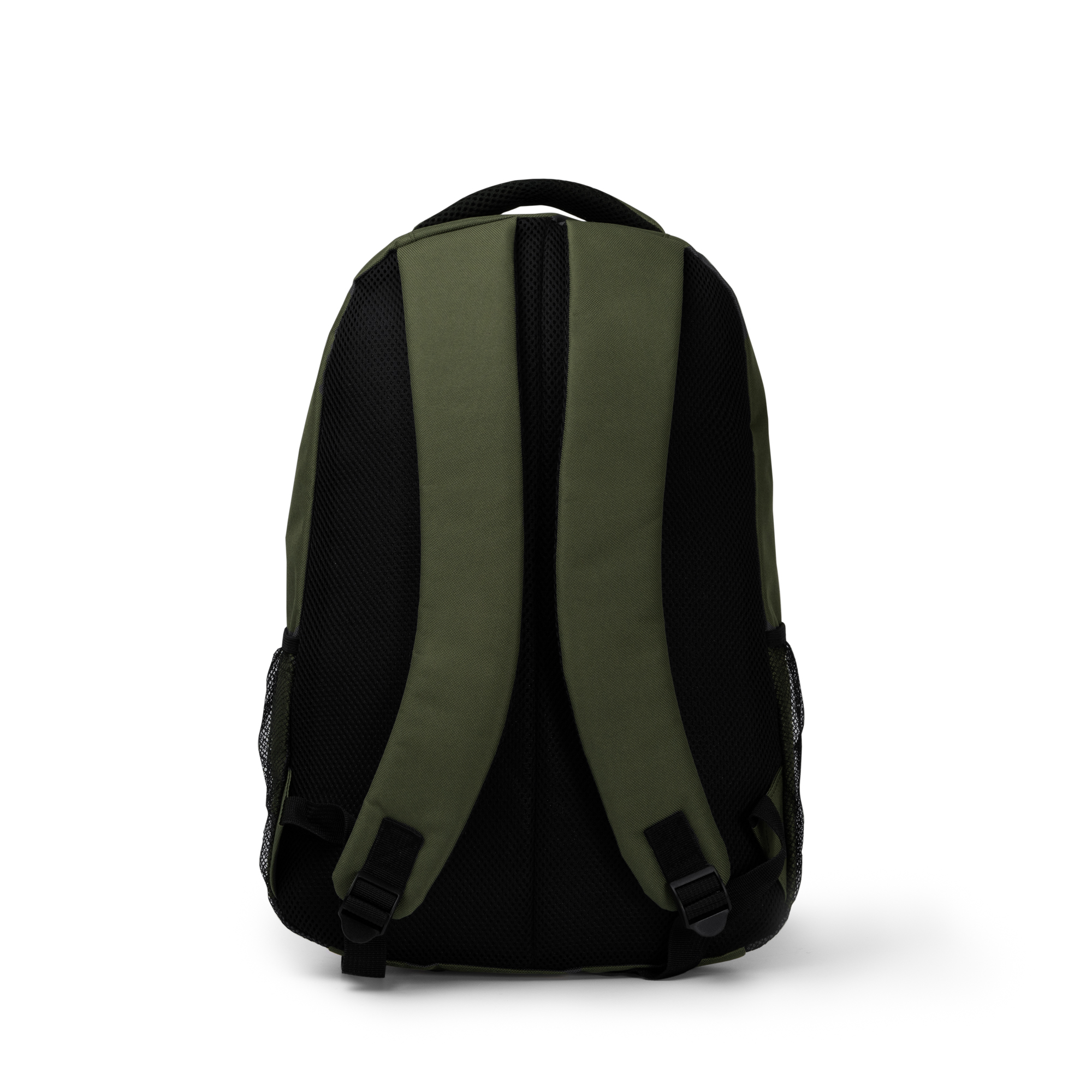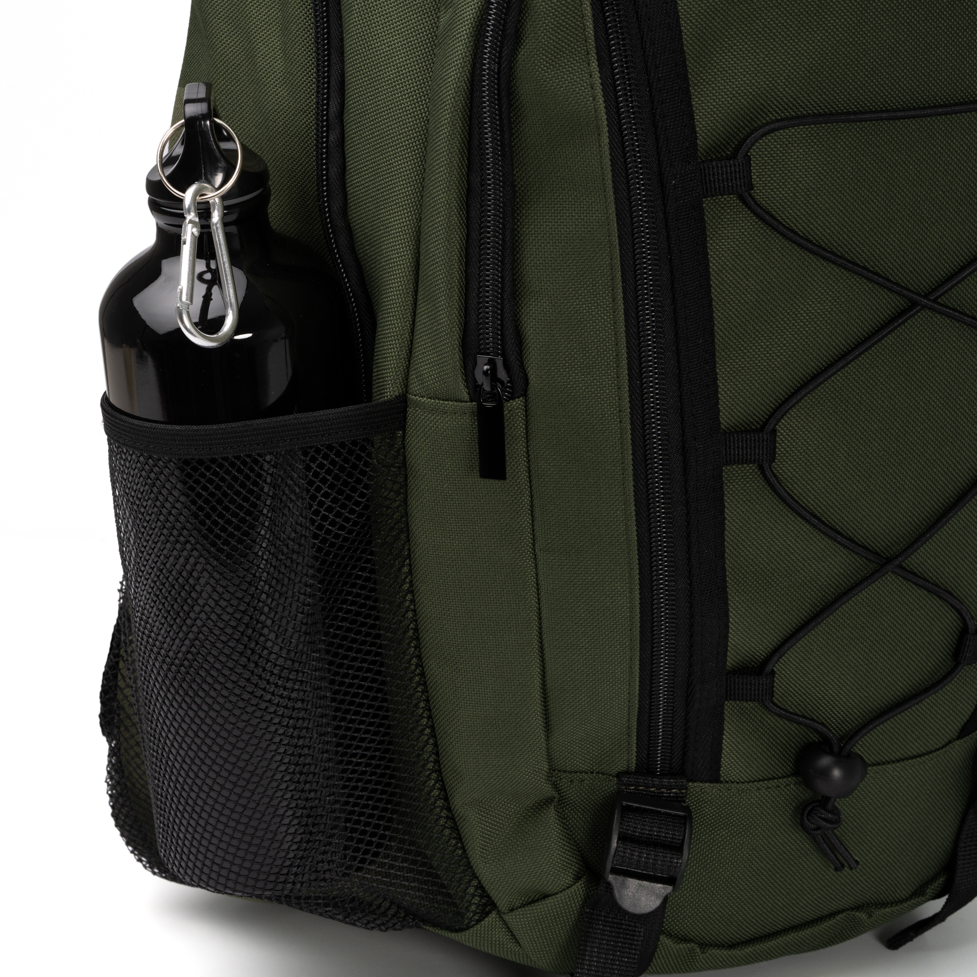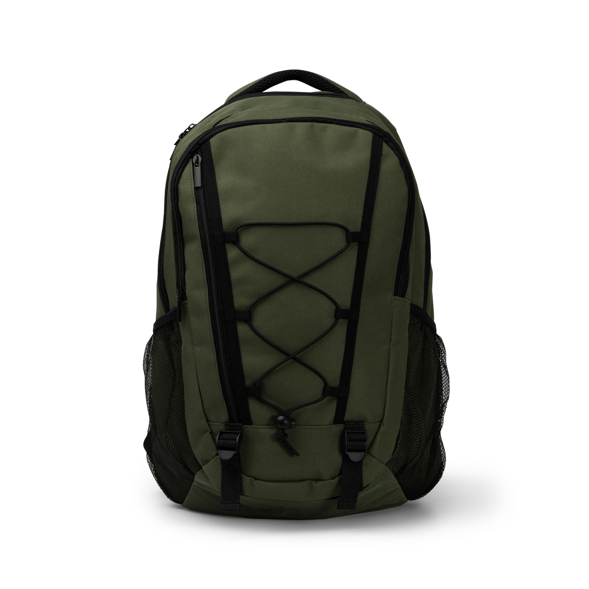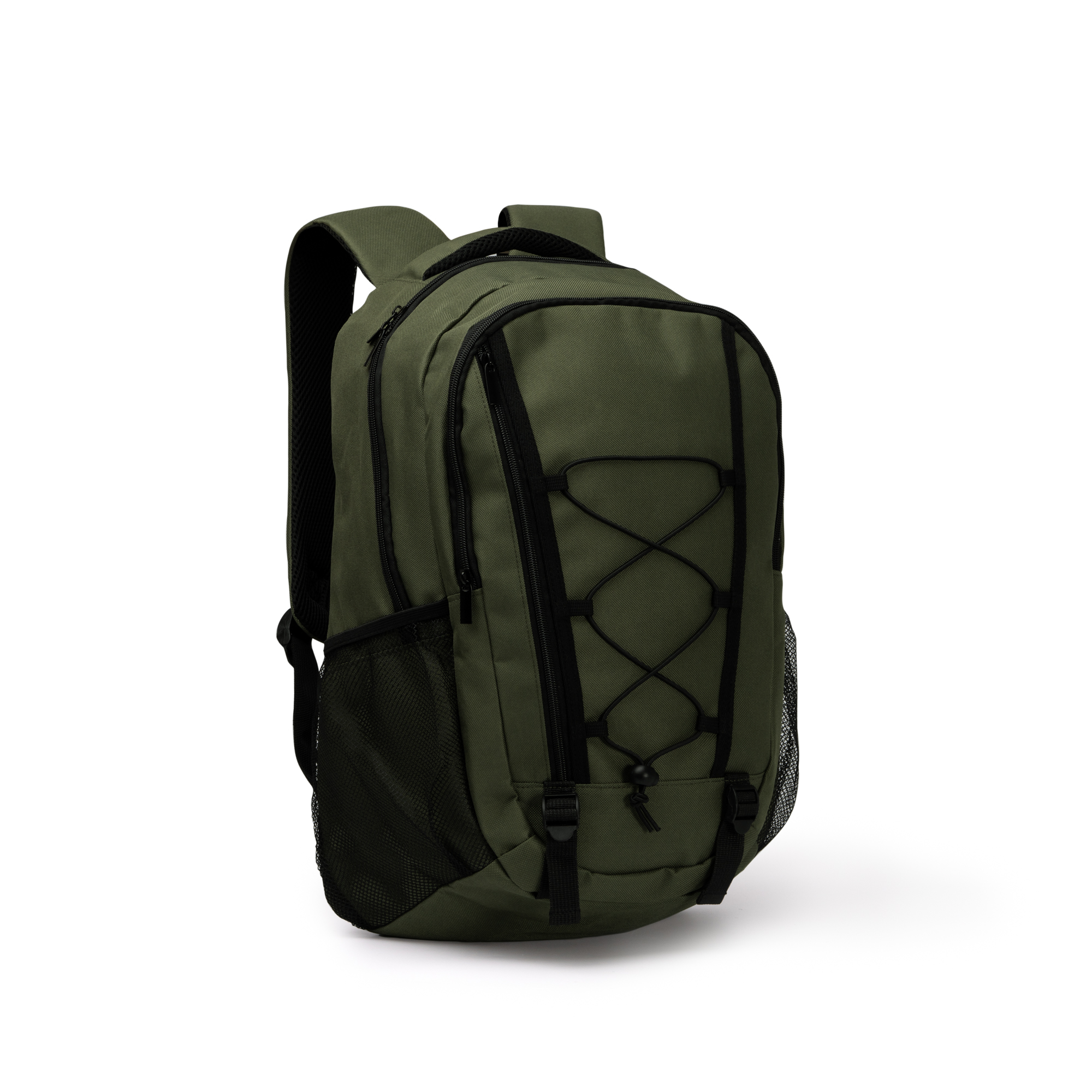 Ryggsekk laget av 600D polyester med to hovedrom. Ett av dem har en lomme for bærbare datamaskiner på opp til 16″. Den har et fremrom med snøring og glidelåslukking og to sidelommer i netting for flasker. Med polstret håndtak og rygg og trekk for komfort, med svarte glidelåser.