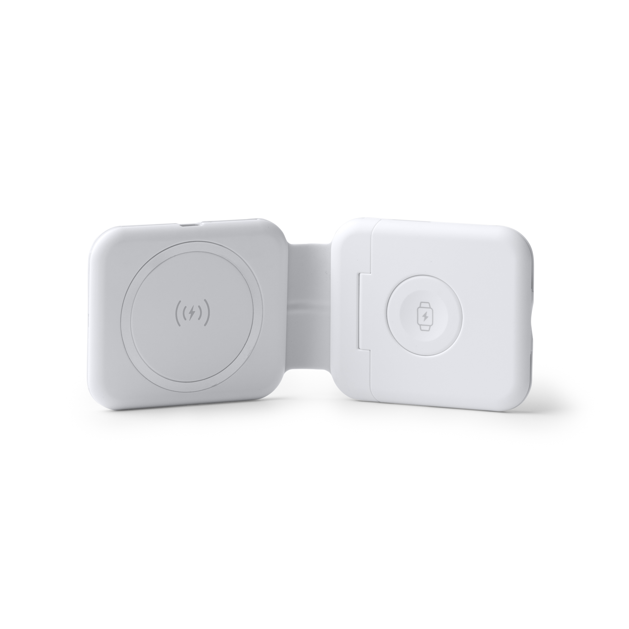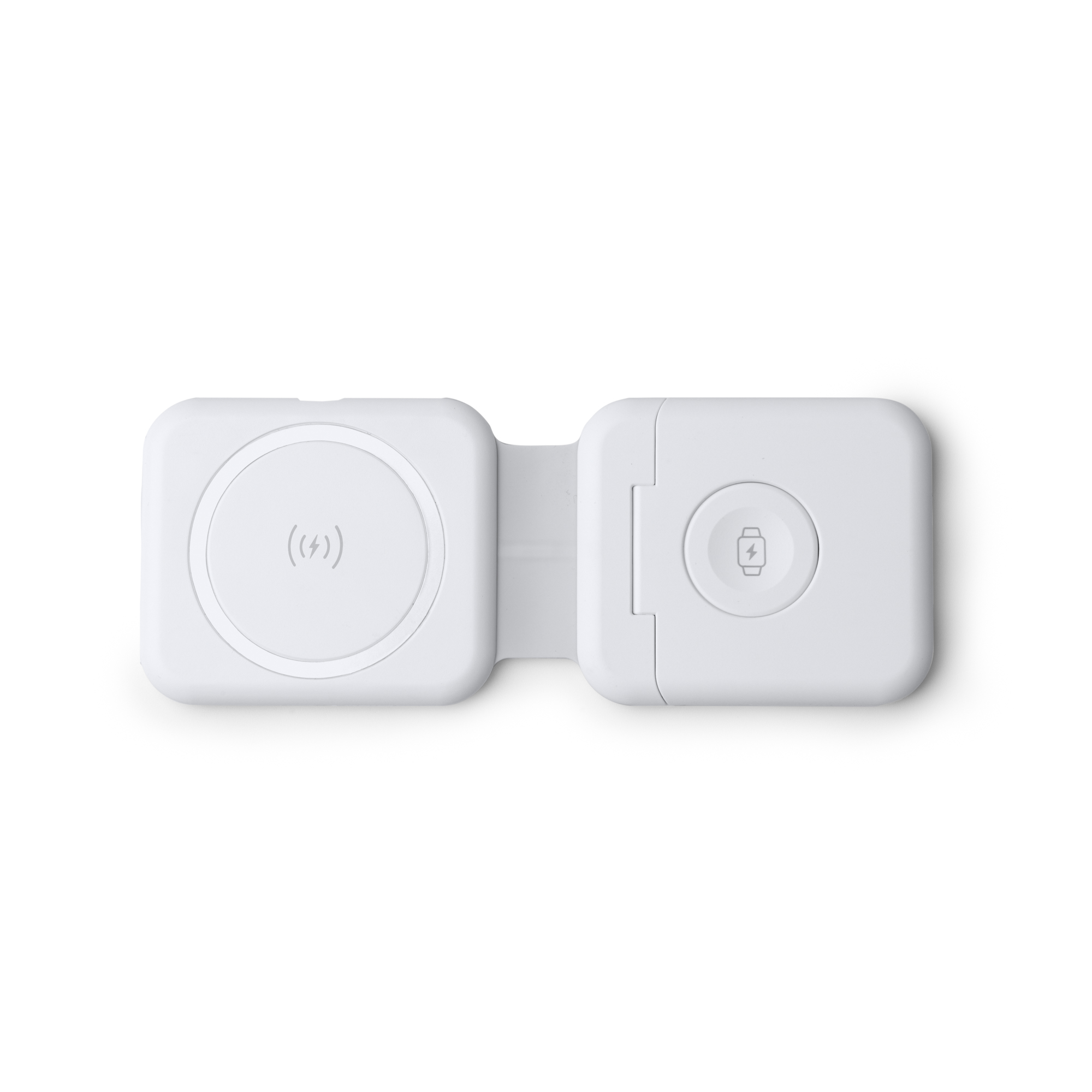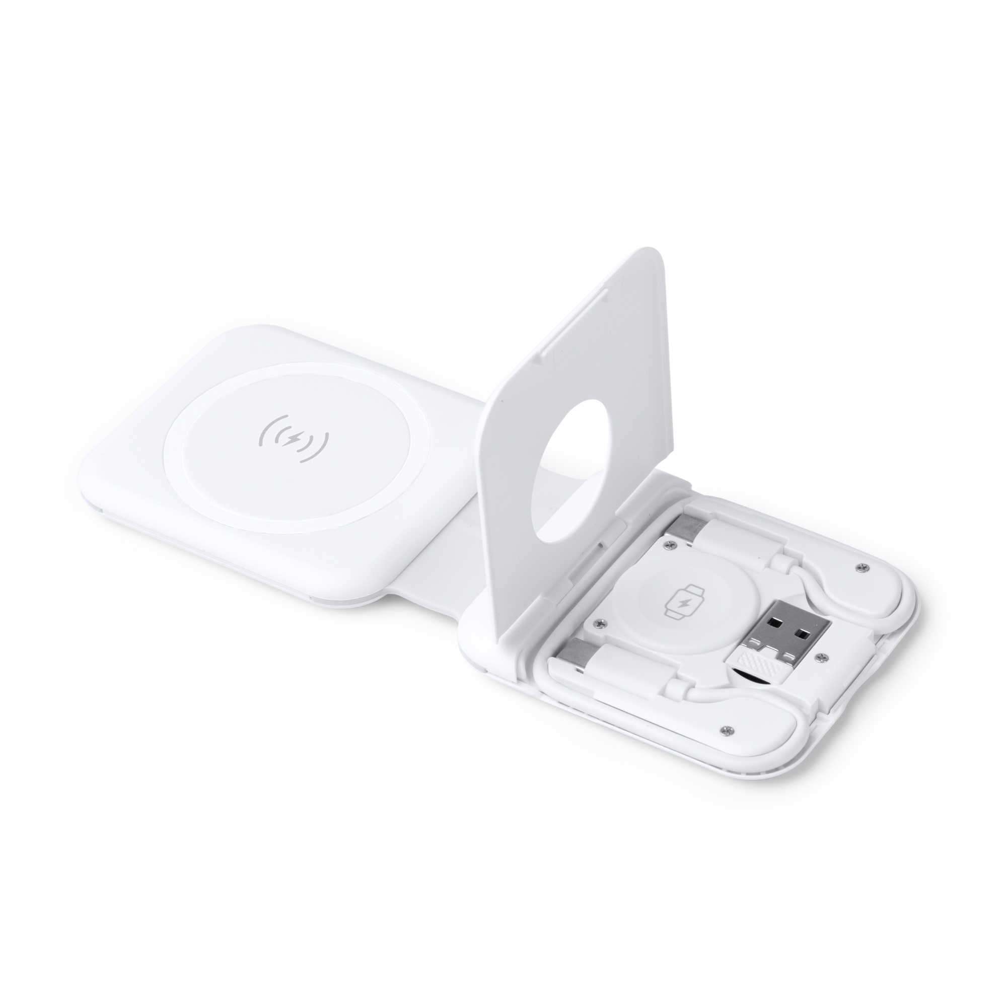 Sammenleggbar 3-i-1 trådløs lader med 15 W kraft. Ideell for reise. Har en base for lading av smarttelefoner og trådløse hodetelefoner, og en annen ladestasjon for smartklokker. Inkluderer type-C-kabel og USB til type-C-adapter.