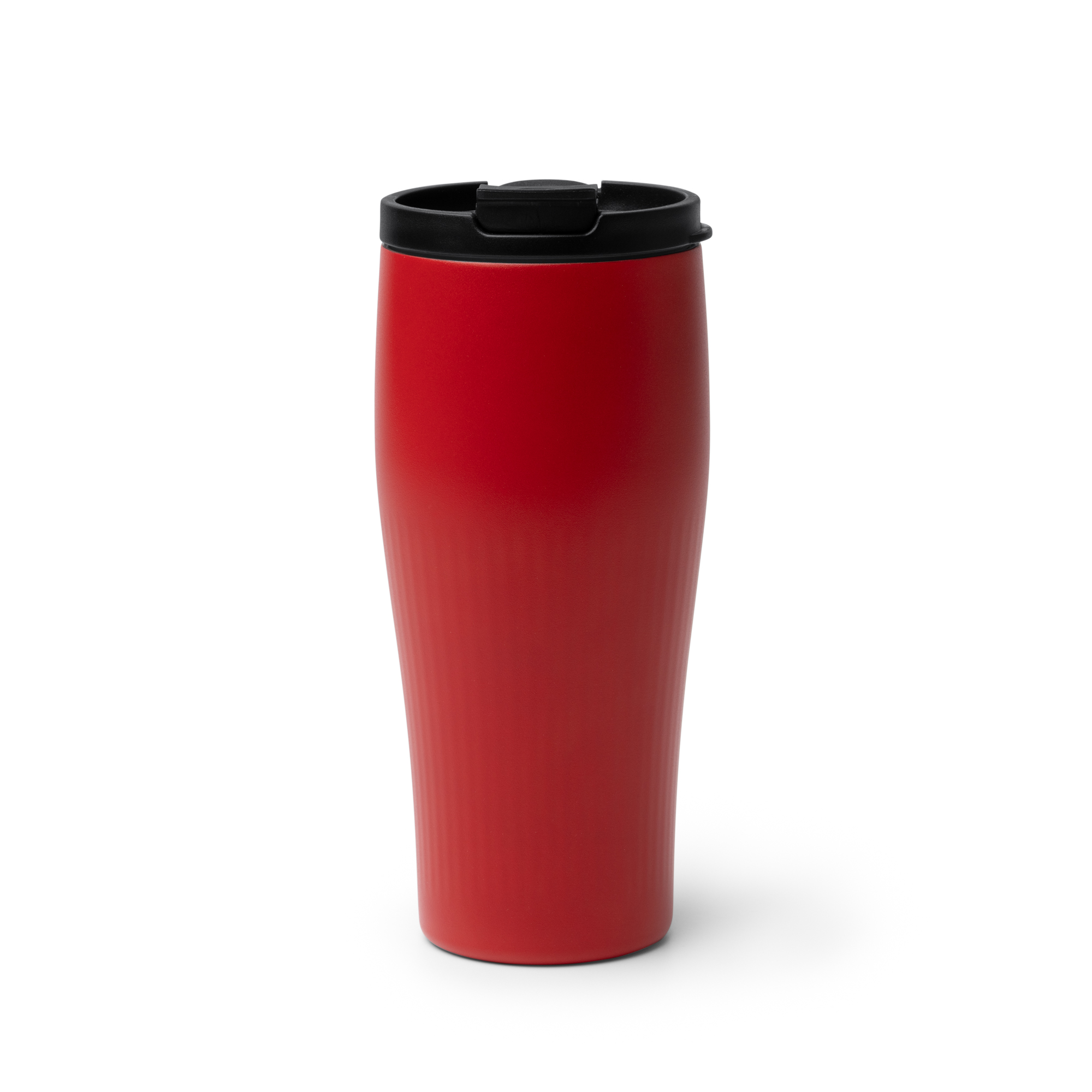 Termoskopp med buet design laget av resirkulert 304 rustfritt stål. Med dobbel vegg, matt finish og kantet tekstur på undersiden. Kapasitet: 500 ml. Skrukork og flippåpning med svart munnstykke.