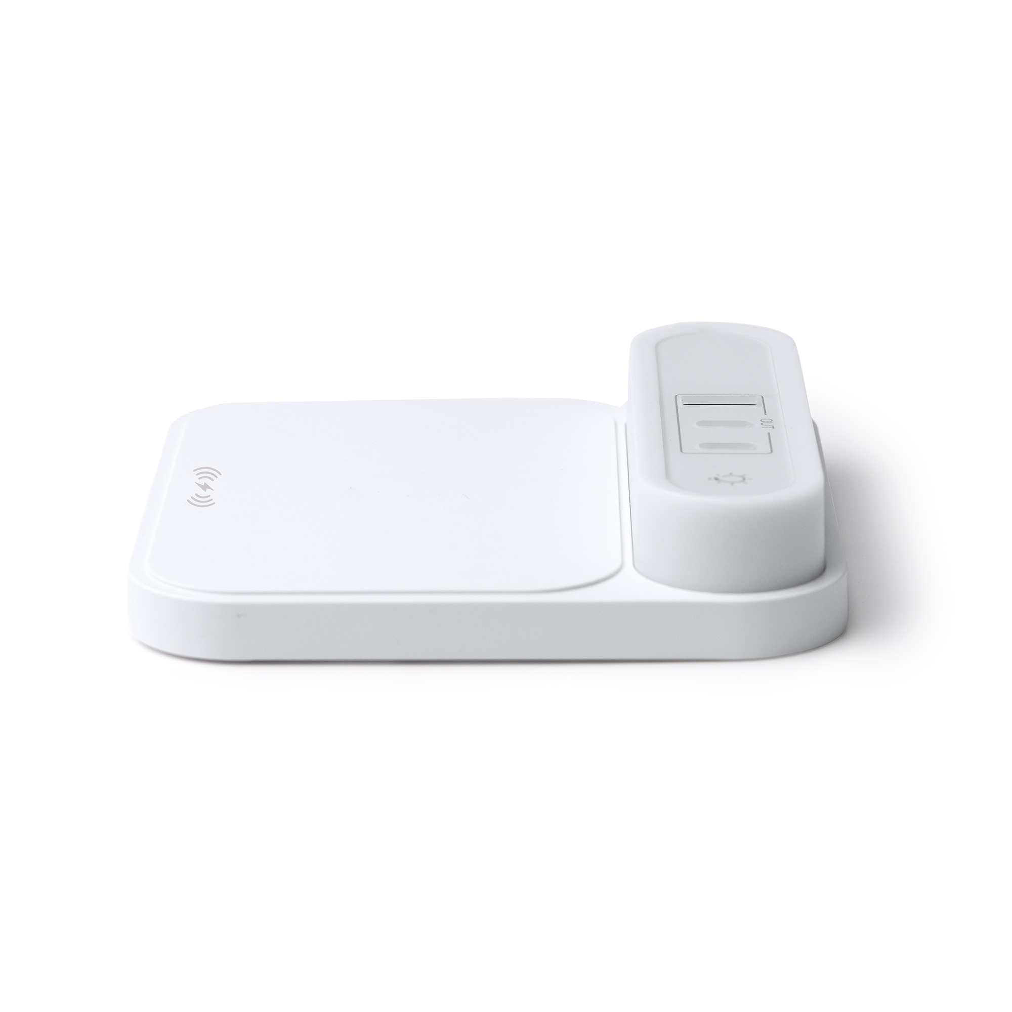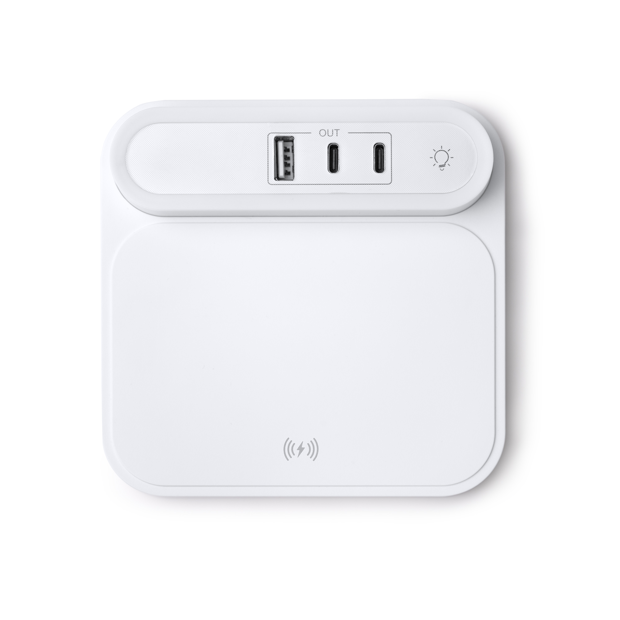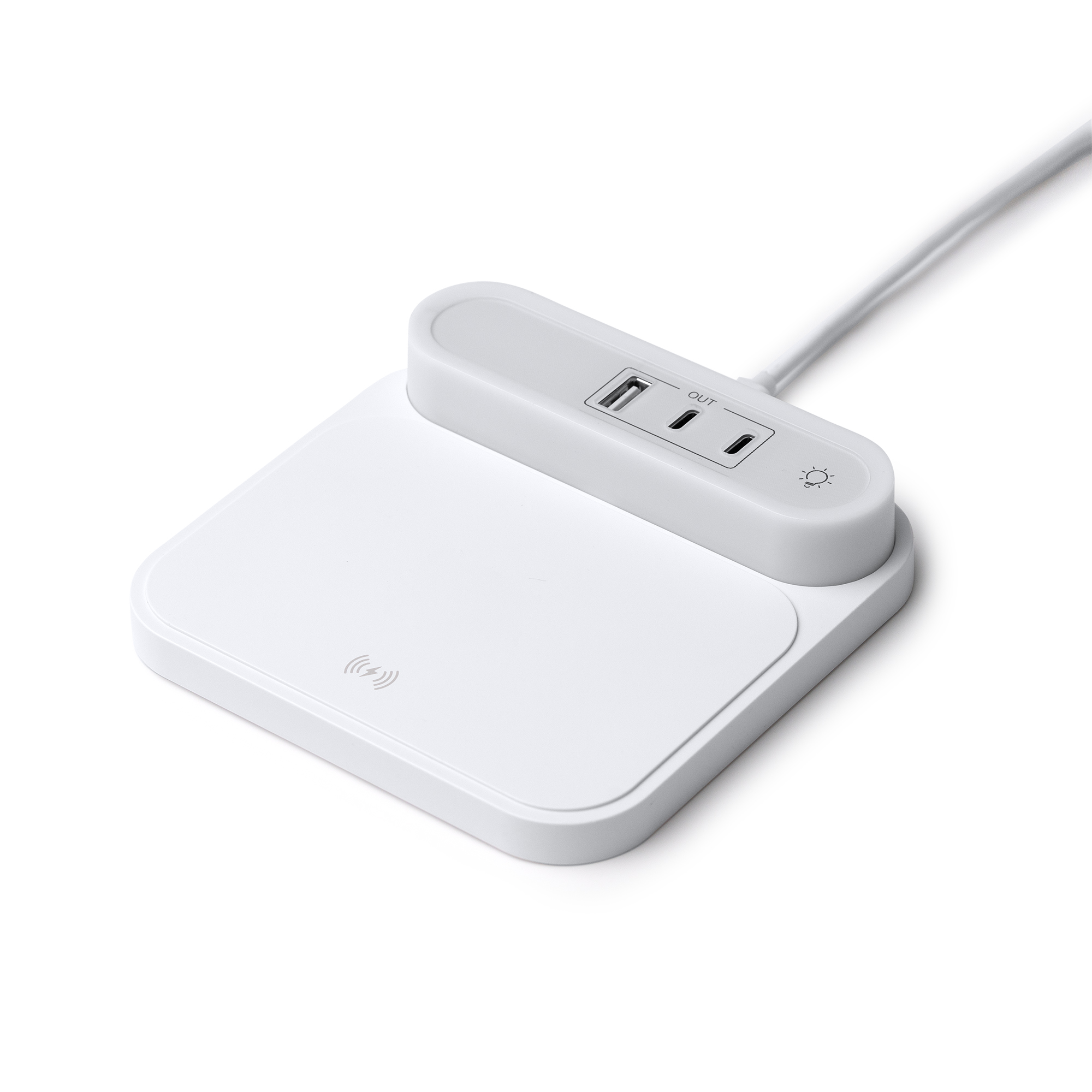 Trådløs ladebase med innebygd lampe. Rask lading: 15 W. Har to utganger for lading via Type C-kabel og en for USB-kabel. Inkluderer type-C-kabel for nettilkobling.
